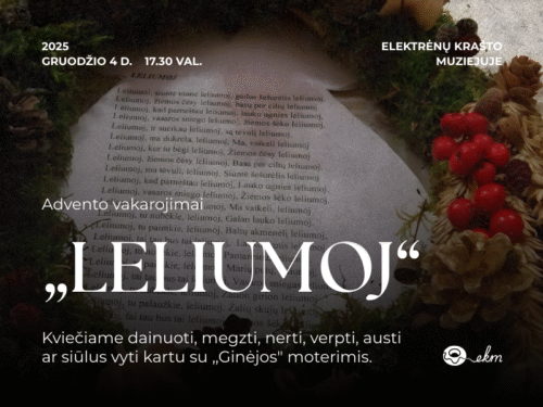 Elektrėnų krašto muziejus kviečia į advento vakarojimus „Leliumoj“ kartu su sutartinių giedotojų grupe „Ginėja“! RENGINIO VIETA: Abromiškių dvaro sodybos svirnas (Elektrėnų sav., Elektrėnų sen., Abromiškių k. Sanatorijos g. 32) RENGINIO LAIKAS: 2025 gruodžio 4 d. 17:30 val.