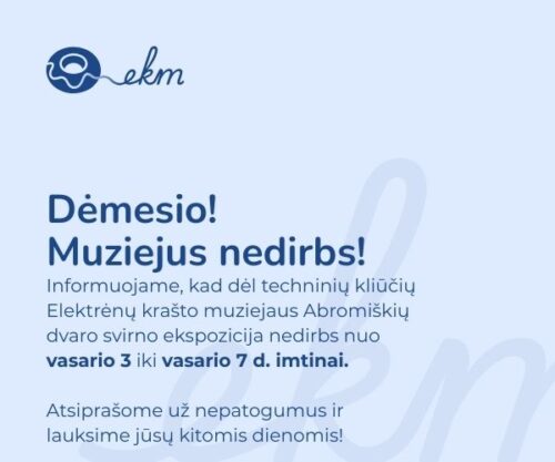 Informuojame, kad dėl techninių kliūčių Elektrėnų krašto muziejaus Abromiškių dvaro svirno ekspozicija nedirbs nuo vasario 3 iki vasario 7 d. imtinai. Atsiprašome už nepatogumus ir lauksime jūsų kitomis dienomis!