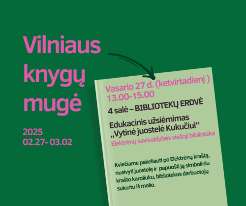 𝐕𝐚𝐬𝐚𝐫𝐢𝐨 𝟐𝟕 𝐝. 𝟏𝟑.𝟎𝟎 𝐯𝐚𝐥. Vilniaus knygų mugėje, 𝐛𝐢𝐛𝐥𝐢𝐨𝐭𝐞𝐤𝐮̨ 𝐞𝐫𝐝𝐯𝐞̇𝐣𝐞 (4 salė), jūsų lauks Elektrėnų bibliotekos 𝐞𝐝𝐮𝐤𝐚𝐜𝐢𝐣𝐚 „𝐕𝐲𝐭𝐢𝐧𝐞̇ 𝐣𝐮𝐨𝐬𝐭𝐞𝐥𝐞̇ 𝐊𝐮𝐤𝐮𝐜̌𝐢𝐮𝐢“.