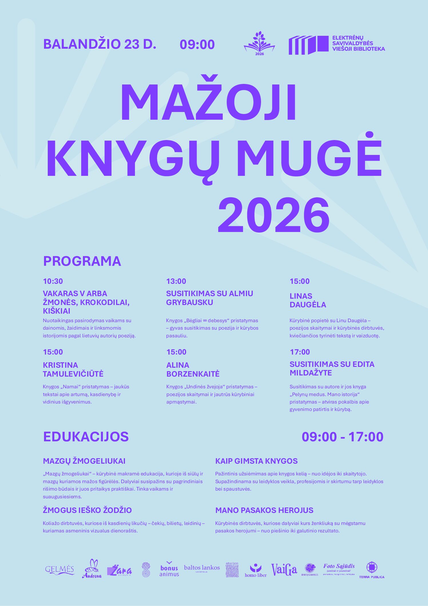 Balandžio 23 dieną Elektrėnų savivaldybės viešojoje bibliotekoje vyks jau tradicija tapusi Mažoji knygų mugė, kurios metu laukia susitikimai su leidyklomis ir autoriais, naujų knygų pristatymai, taip pat daugybė kūrybinių edukacijų.