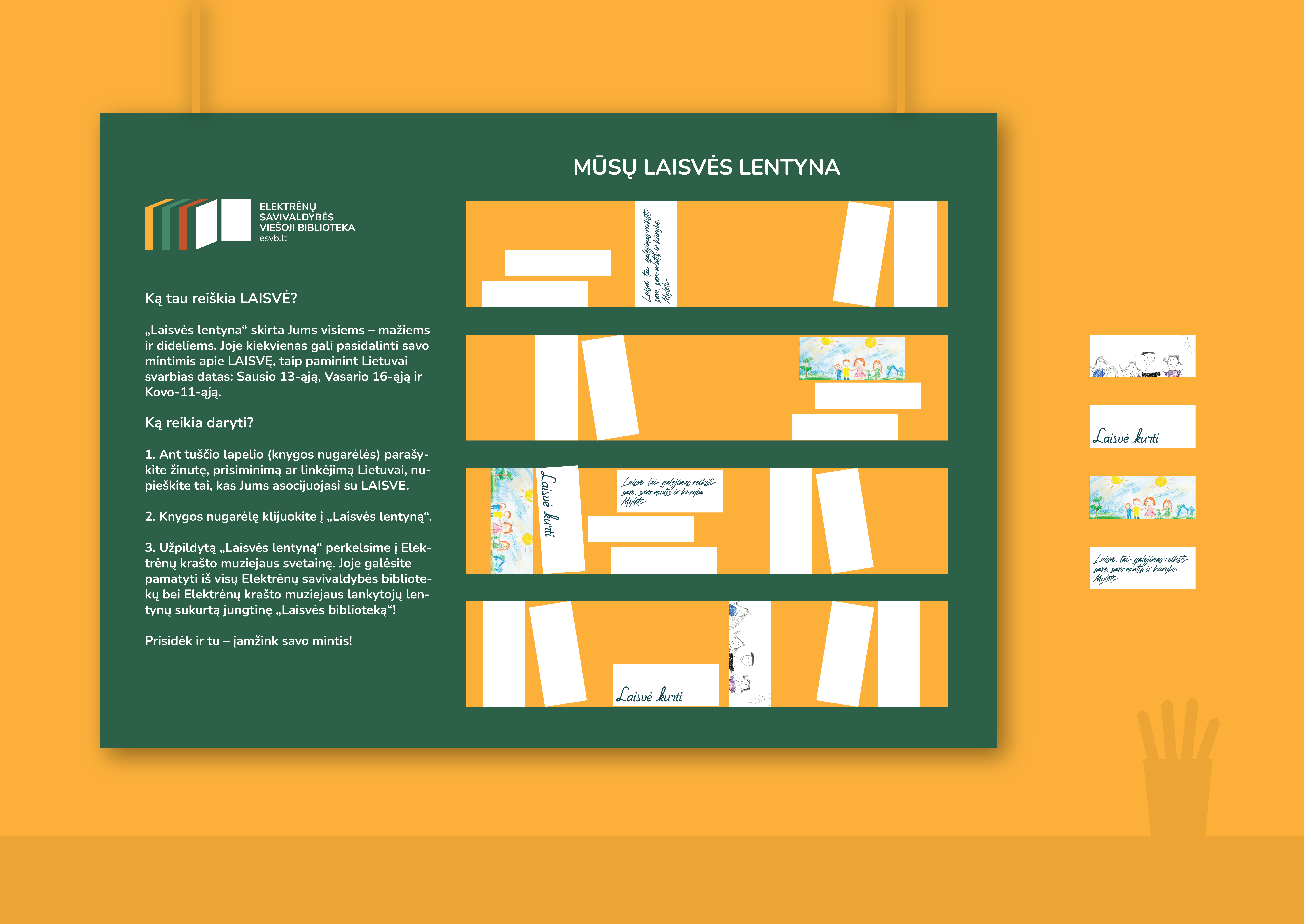 „Laisvės lentyna“ skirta Jums visiems – mažiems ir dideliems. Joje kiekvienas gali pasidalinti savo mintimis apie LAISVĘ, taip paminint Lietuvai svarbias datas: Sausio 13-ąją, Vasario 16-ąją ir Kovo-11-ąją.