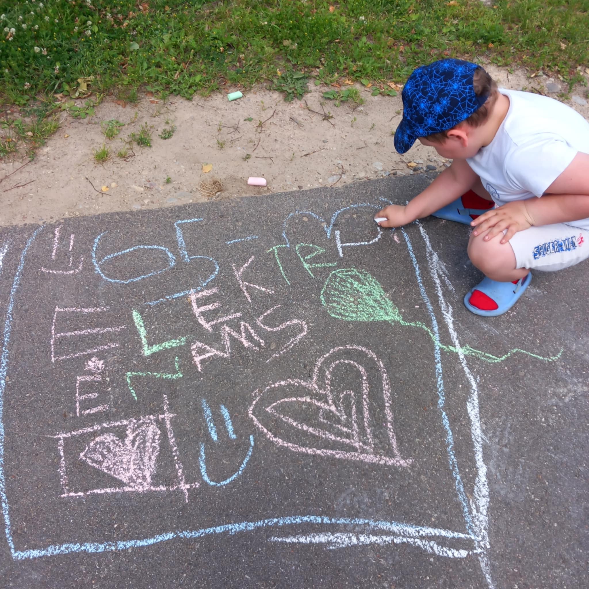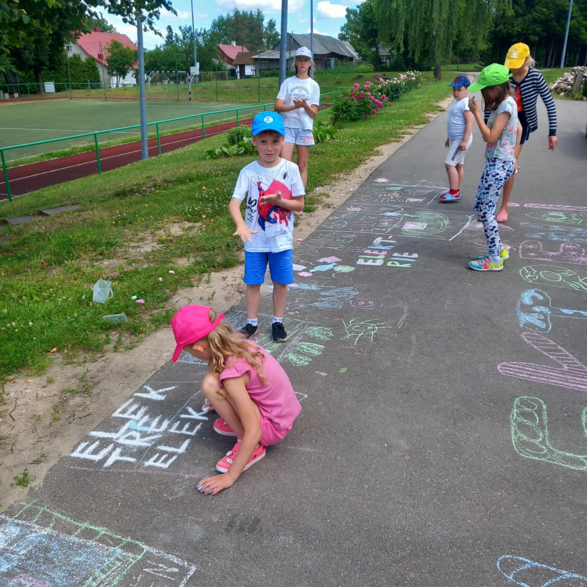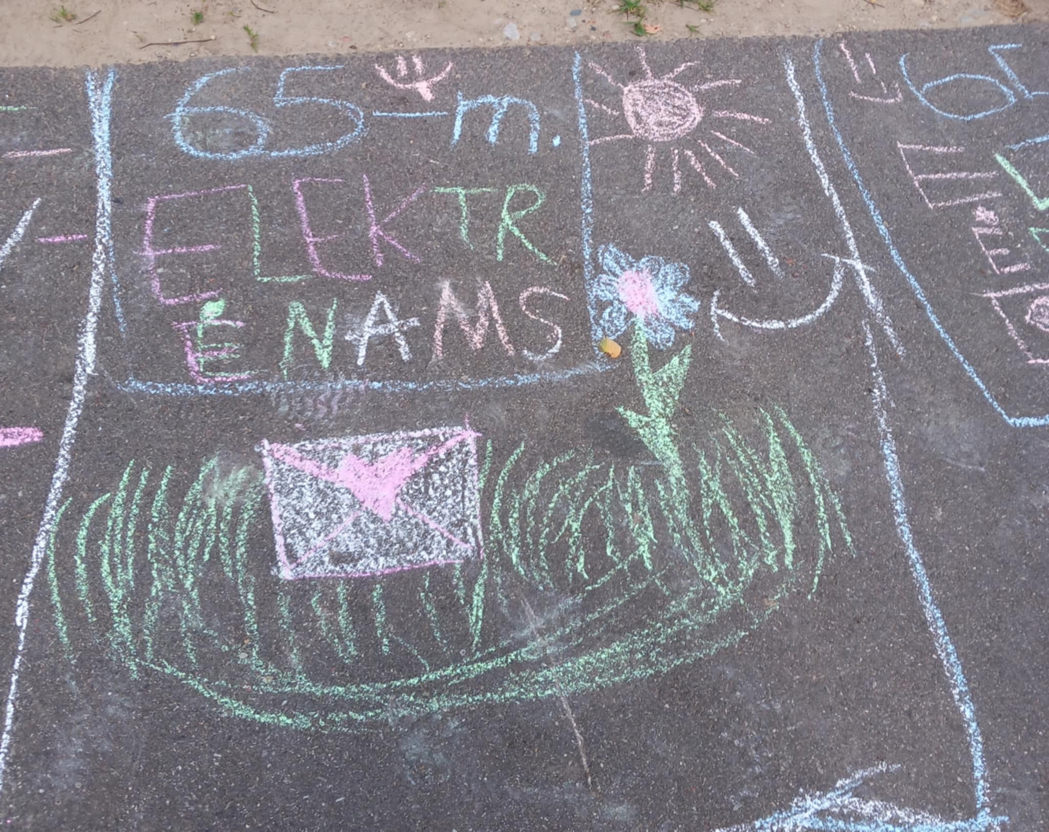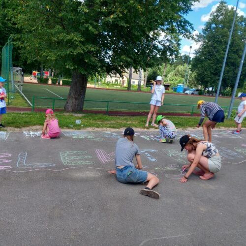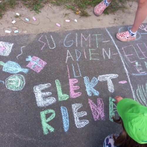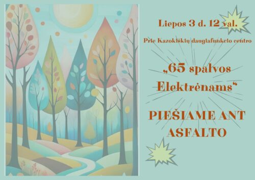 Vaikų kūryba. Vaikai pieš kreidelėmis ant asfalto apie Elektrėnų krašą su palinkėjimais. Renginys skirtas Elektrėnų 65-mečiui.
