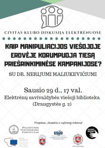 29 d. 17 val. Elektrėnų savivaldybės viešojoje bibliotekoje įvyks civitas klubo diskusija „Kaip manipuliacijos viešojoje erdvėje korumpuoja tiesą priešrinkiminėse kampanijose?”. Dalyvaus lektorius dr. N. Maliukevičius, kartu su juo atvyks ir diskusiją kuruoti padės dr. Ieva Petronytė – Urbonavičienė.