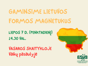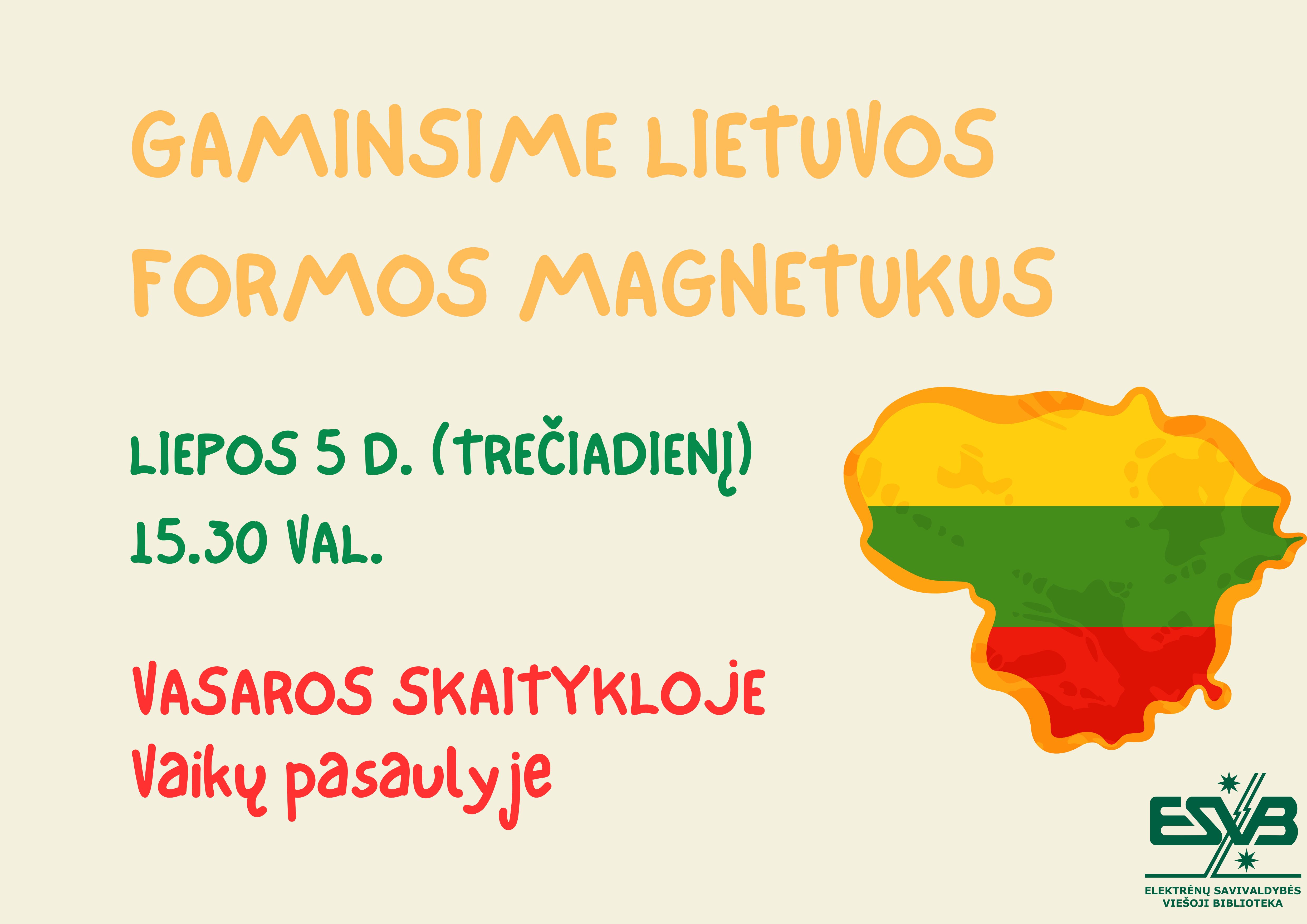 Kviečiame vaikus pasigaminti Lietuvos formos magnetukus. Užsiėmimas vyks Vasaros skaitykloje Vaikų pasaulyje.