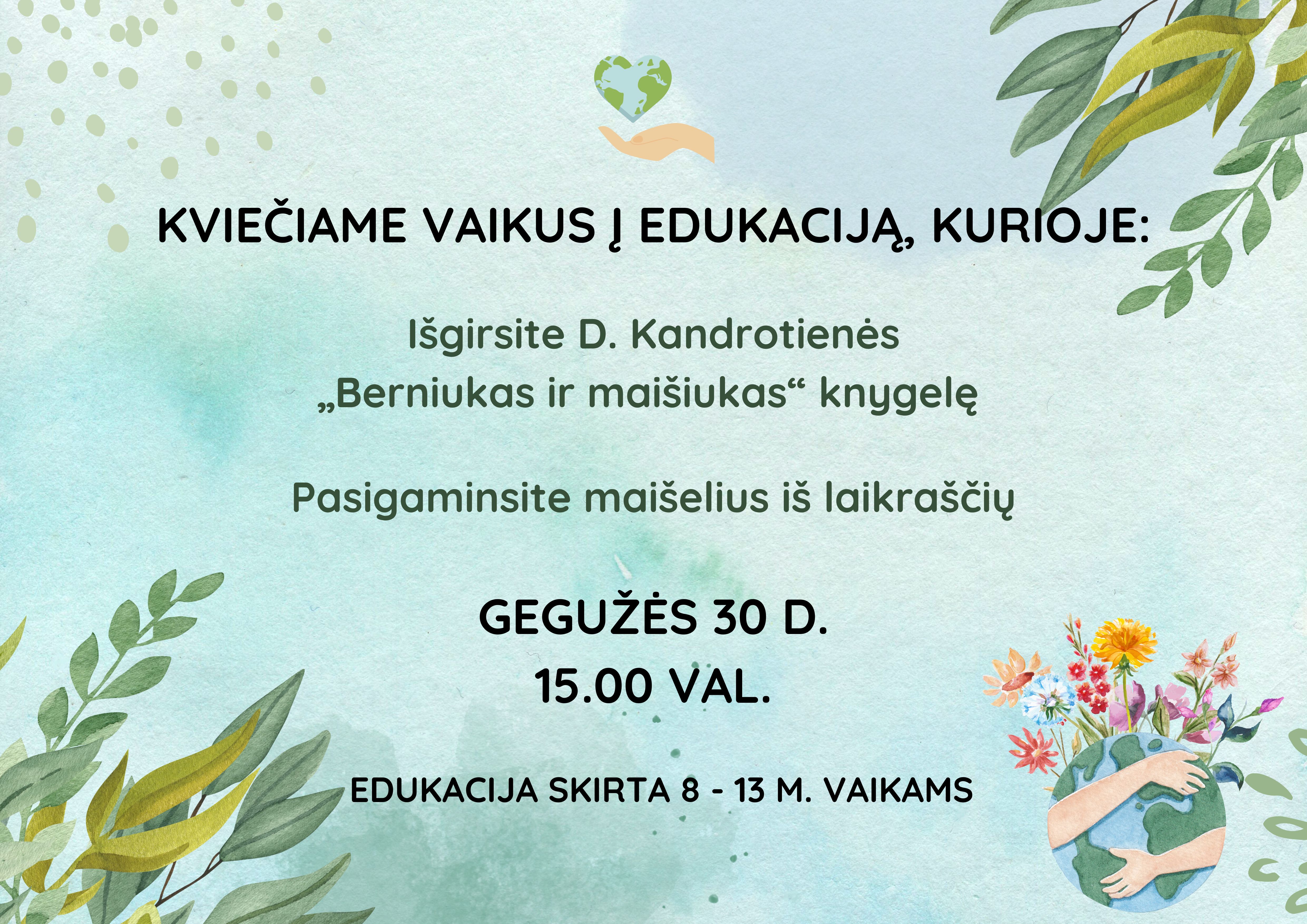 Gamta – mūsų visų namai. Tai yra pats svarbiausias argumentas, kodėl turime saugoti ją bei mus supančią aplinką. Kviečiame vaikus į edukaciją kurioje skaitysime D. Kandrotienės „Berniukas ir maišiukas“ knygelę. Kartu pasigaminsime maišelius iš laikraščių.