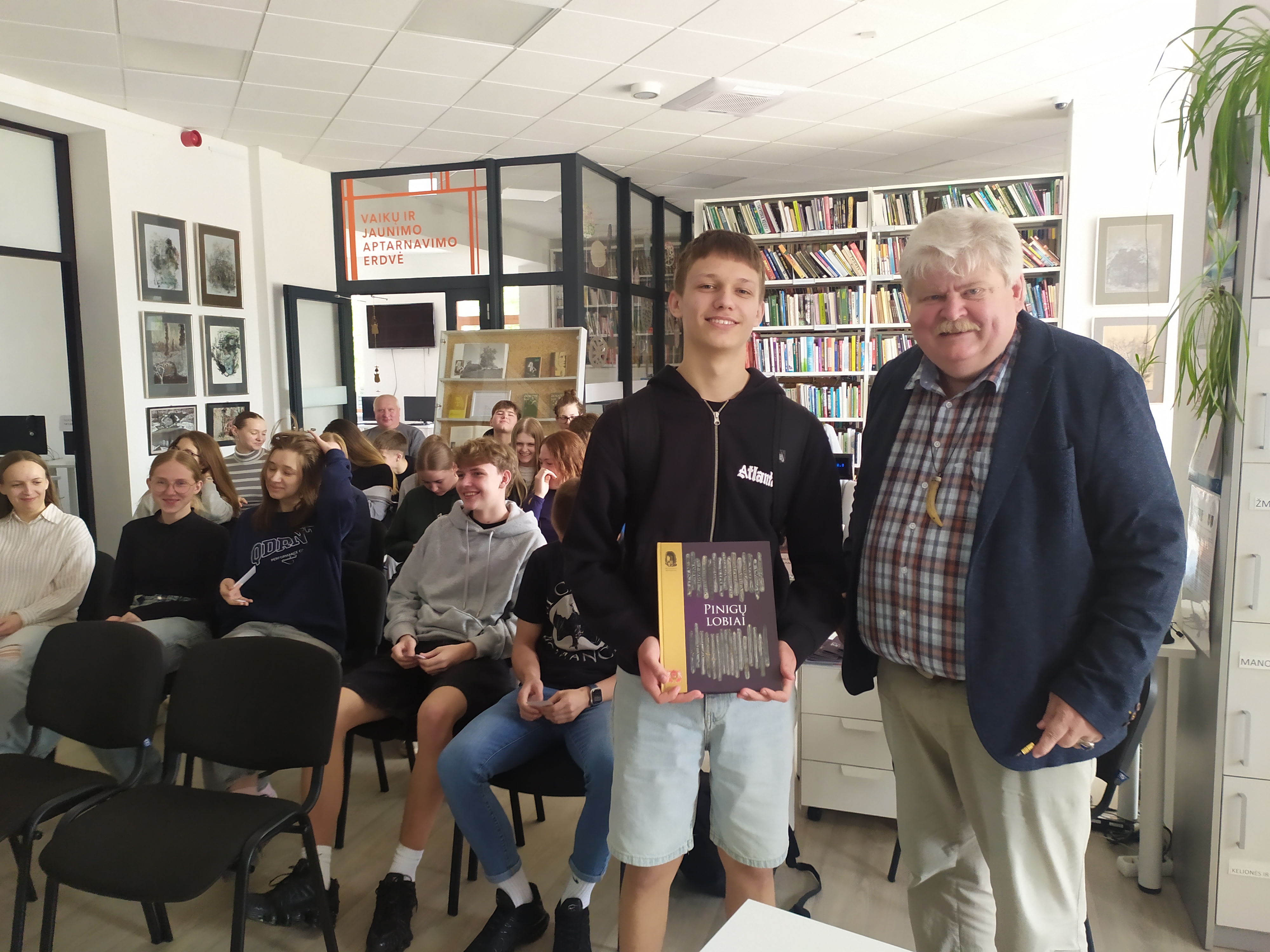 Gegužės 26 d. Vievio gimnazijos mokinius kvietėme dalyvauti istoriko V. Poviliūno paskaitoje „Ką pasakoja Vievio monetų lobiai”. Paskaita, skirta supažindinti mokinius su Vievio istorija ir regiono kultūra, per konkrečią bei įdomią temą – monetų lobius, rastus Vievio miesto teritorijoje. Po paskaitos buvo surengta teminė loterija be pralaimėjimų, kurios metu dalyviai laimėjo ženklelius, susijusius su paskaitos tema, o patį laimingiausią bilietą pavyko ištraukti Adomui. Adomas gavo knygą „Monetų lobiai” su autoriaus parašu