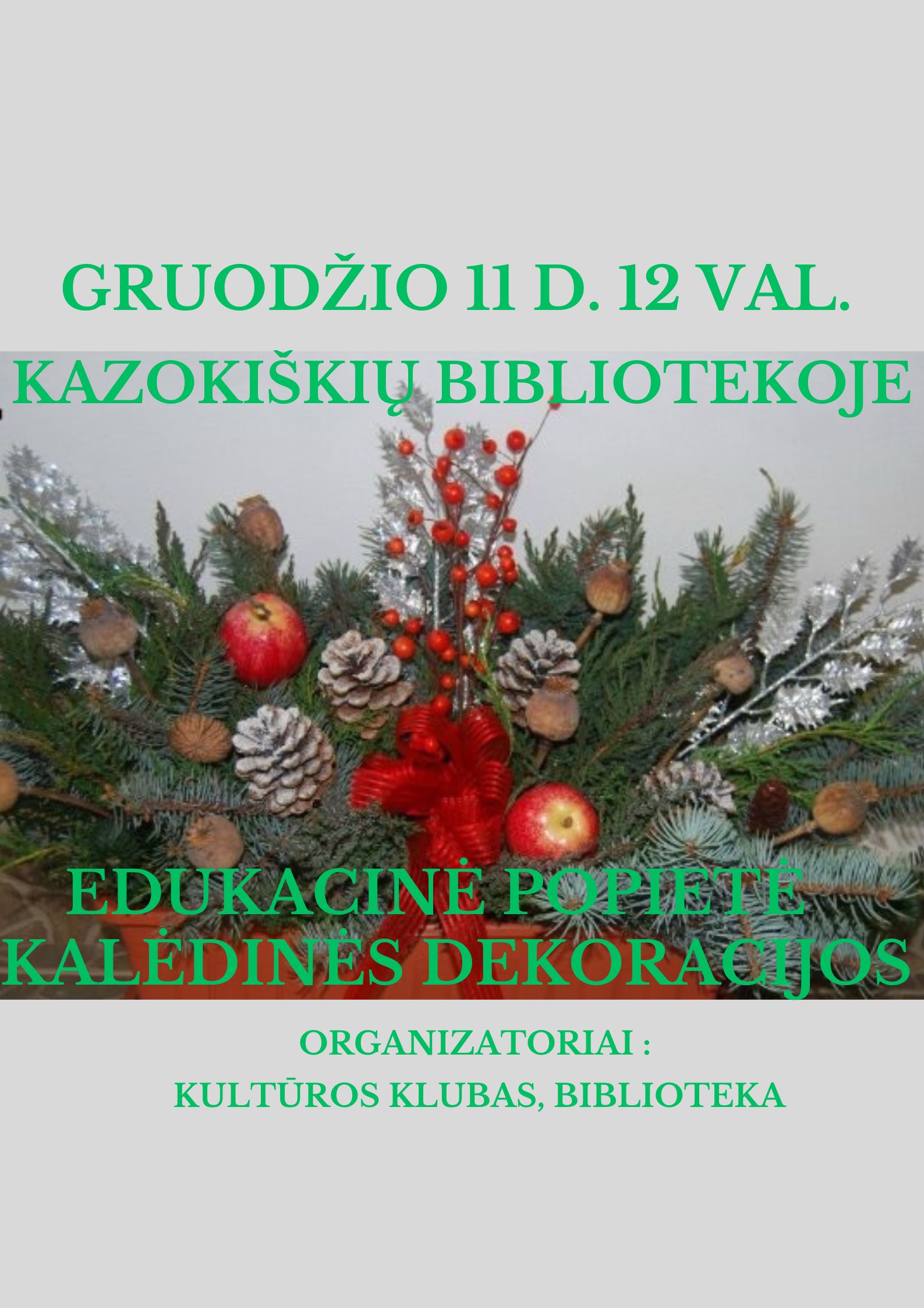 Kalėdoms skirta floristikos edukacija. Jos metu gaminsime dekoracijas pasipuošti namus kalėdiniam laikotarpiui. Renginio auditorija – įvairaus amžiaus grupės nariai.