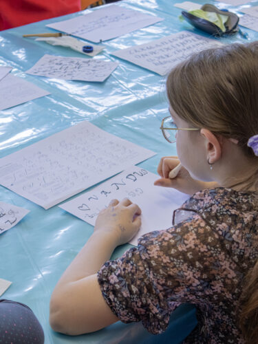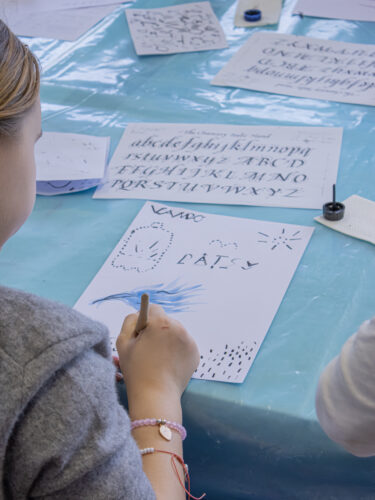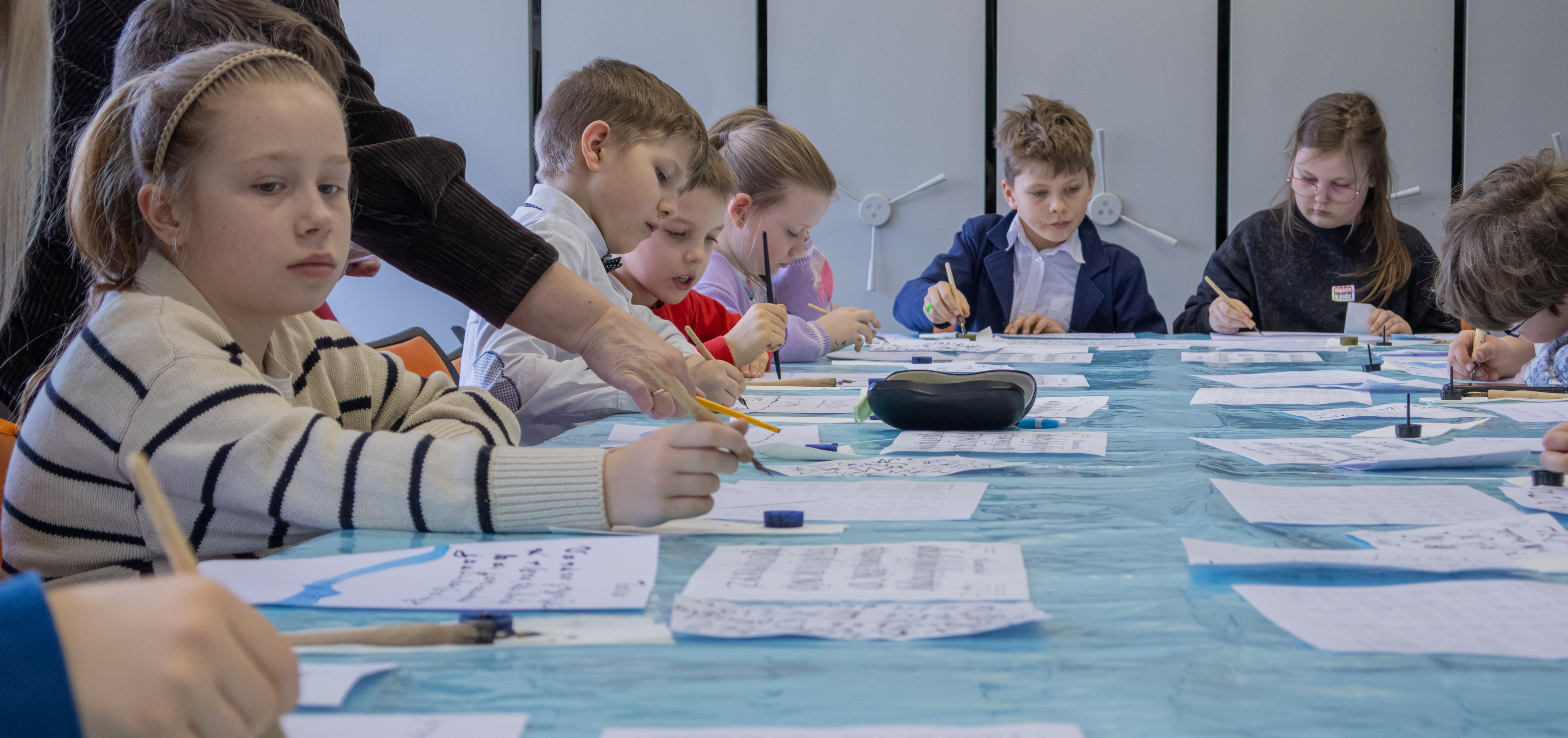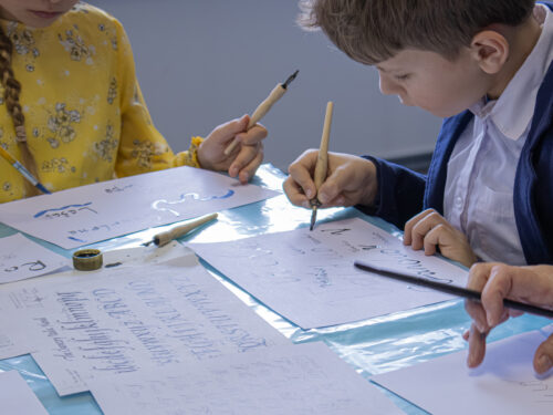 Užsiėmimų metu dalyviai susipažįsta su teksto komponavimo pagrindais, mokosi kurti kaligrafinius tekstus ir inicialus, eksperimentuoja su įvairiais šriftais, dekoratyviniais elementais bei ornamentais. Taip paverčiant rašymo procesą kūrybine saviraiškos forma. Be to, kaligrafija reikalauja atidumo detalėms, tikslumo ir kantrybės, kas akivaizdžiai gerina smulkiąją motoriką ir akių-rankų koordinaciją. Užsiėmimai taip pat skatina savikritiką ir gebėjimą analizuoti bei vertinti savo ir kitų darbų estetiką. Kviečiame prisijungti prie šio nuoseklaus mokymosi proceso, stiprinančio kultūrinę tapatybę ir skatinančio meilę ranka rašomam žodžiui. Rašymas suteikia daug gražių ir prasmingų akimirkų, išlaisvina fantaziją, padeda nusiraminti ir atsipalaiduoti. Galiausiai, ant kiekvieno stalo lieka tik rašalo likučiai, o mokiniai, saugodami savo dailųjį kūrinį, keliauja namo.