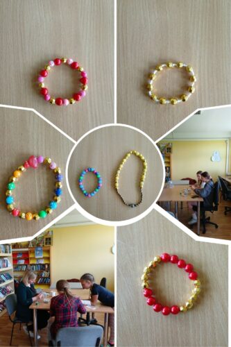 Bibliotekos lankytojai pasitelkę fantaziją, karoliukus pasigamino spalvingas draugystės apyrankes.