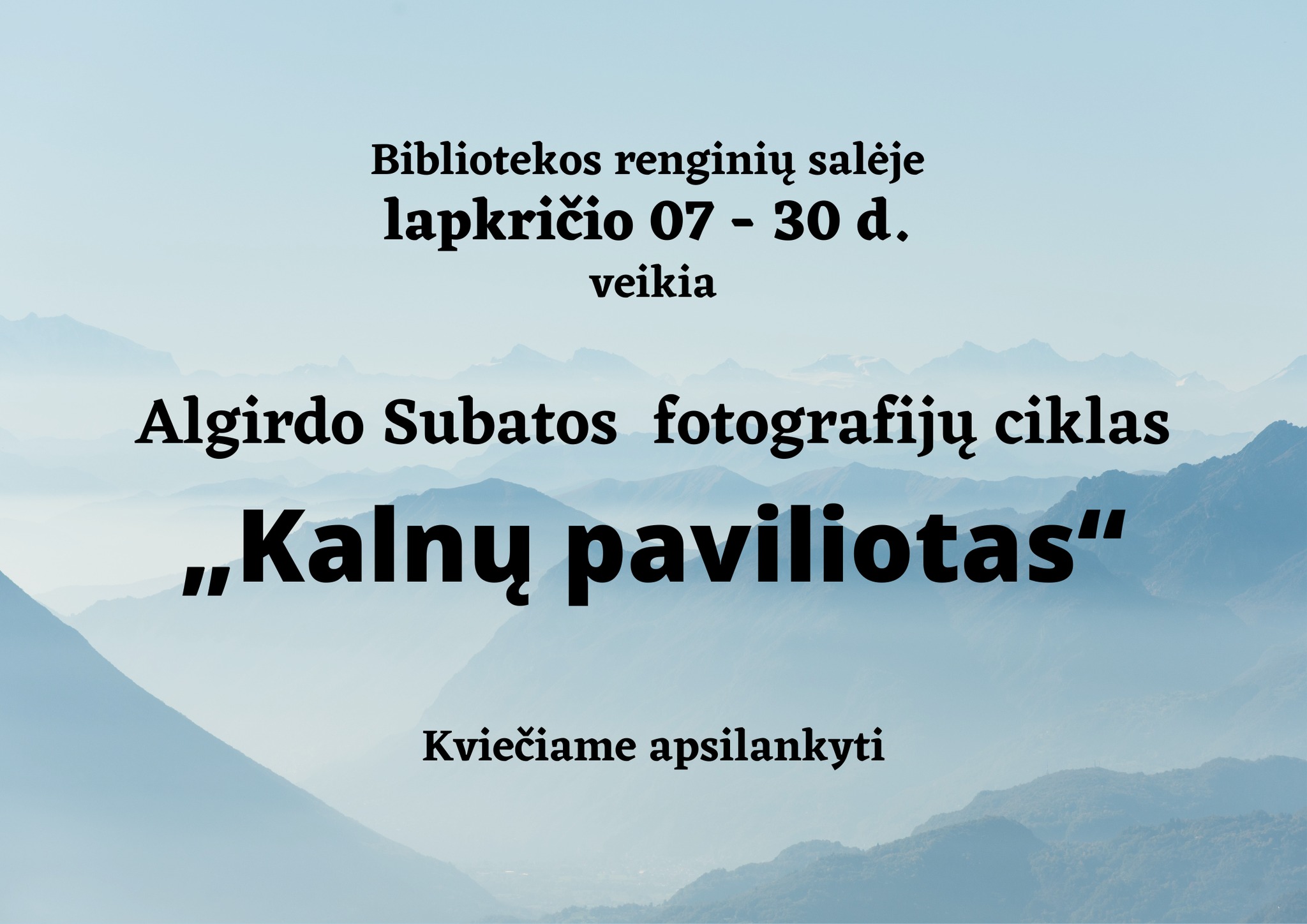 MALONIAI KVIEČIAME VISUS APSILANKYTI ELEKTRĖNŲ SAVIVALDYBĖS VIEŠOJOJE BIBLIOTEKOJE IR APŽIŪRĖTI FOTOGRAFIJŲ CIKLĄ „KALNŲ PAVILIOTAS“