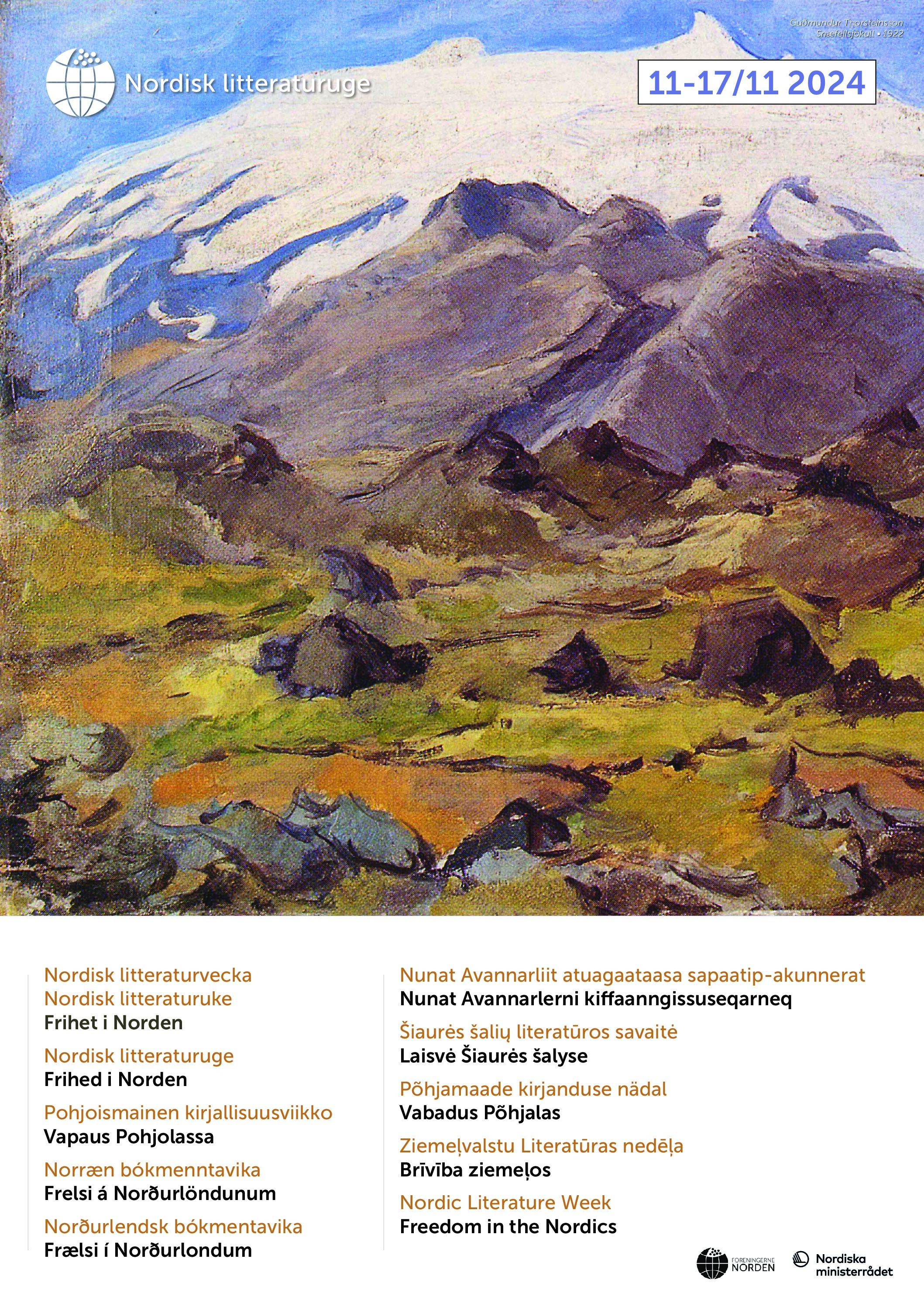 Siedami Islandijos 80-metį su tema „Laisvė Šiaurės šalyse”, tikimės, kad Šiaurės šalių literatūros savaitė taps platforma diskutuoti ir tyrinėti mintis apie laisvę ir bendruomenę. Siekiame įkvėpti pokalbiams apie tai, ką kiekvienam iš mūsų reiškia laisvė ir kaip galime kartu stiprinti laisvę ir bendruomenę mūsų visuomenėse – dabar ir ateityje.