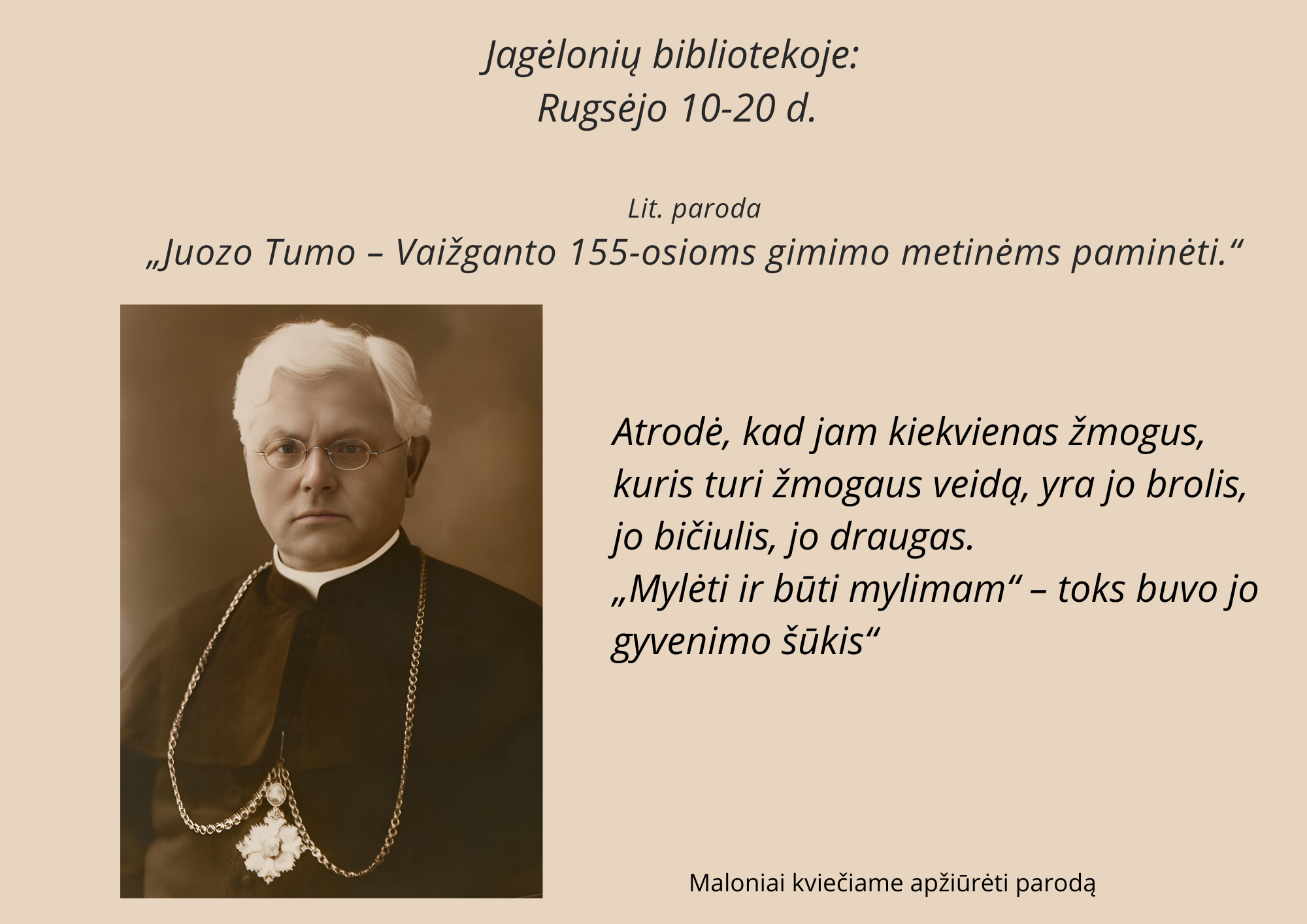 Juozo Tumo – Vaižganto 155-osioms gimimo metinėms paminėti. Juozas Tumas-Vaižgantas (1869–1933) – viena iš ryškiausių XX a. pirmos pusės asmenybių, tautinio atgimimo ir moderniosios kultūros reiškėjas. Vaižgantas tautą suvokė kaip esmingą žmoniškumo formą, kuri auga iš gimtosios žemės, istorijos, atsiskleidžia kalba, kūryba, darniais tarpusavio santykiais. Įvairiašakės Vaižganto veiklos tikslas buvo jungti tautą, kad bendradarbiautų tėvynės labui. Lietuvių kultūros veikėjų gretoje Vaižgantas yra „šalia Antano Strazdo, Motiejaus Valančiaus: teisingas, tiesus, dosnus, altruistiškas, nesigviešiantis turtų, nesitaikstantis prie visuomenės konvencijų, tolerantiškas bet kokių pasaulėžiūrų ar politinių įsitikinimų žmonėms, atlaidus žmogiškoms silpnybėms ir reiklus sau, demokratiškas iš esmės – nuo buities iki viešojo gyvenimo“ (Vanda Zaborskaitė).