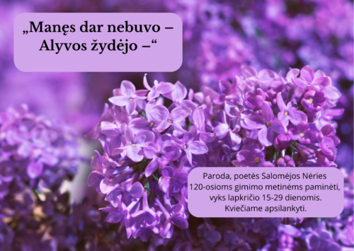 Paroda skirta Salomėjos Nėries, poetės 120-osioms gimimo metinėms. Bibliotekoje galite rasti S. Nėries poezijos ir šias knygas: V. Alekna „Salomėja“, V. Daujotytė „Salomėja Nėris/Fragmento poetika“, A. Ruseckaitė „Padai pilni vinių“.