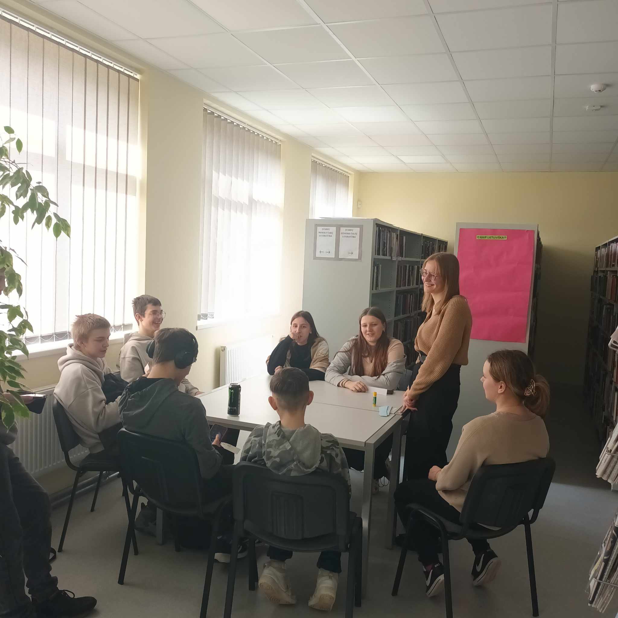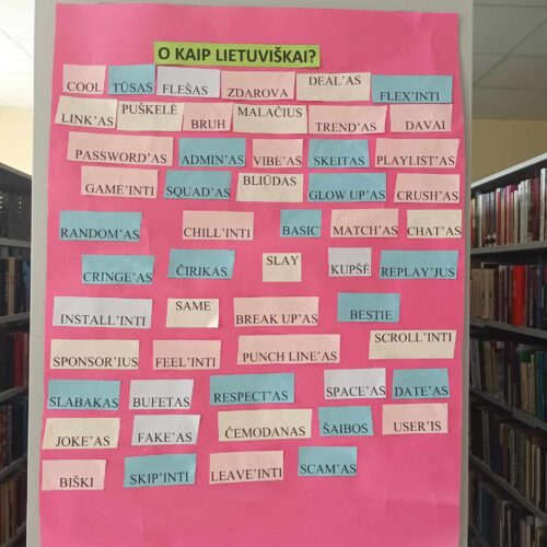 Kovo 15 dieną, savanorė Karolina puikiai praleido popietę su jaunimu. Vyko diskusija “O kaip lietuviškai?”. Mokiniai traukė lapelius su anglicizmais, rusizmais, lietuviškais tarmiškais žodžiais ir turėjo juos „išversti” į bendrinę lietuvių kalbą. Jaunimas greitai rado tinkamus atitikmenis. Dažnai net nepastebime, kad kalbėdami įtraukiame ir kitų kalbų žodžius į lietuvių kalbą. Lauksime visų sugrįžtant į kitas diskusijas ir užsiėmimus