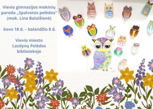 Paukščiams ir pavasariui pasitikti Vievio m. Lazdynų Pelėdos bibliotekoje eksponuojama Vievio gimnazijos mokinių (mok. Lina Balaišienė) spalvintų pelėdų paroda.