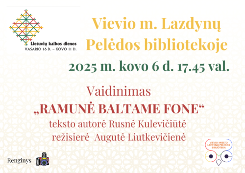 Elektrėnų „Versmės“ gimnazijos mokiniai suvaidins vaidinimą „Ramunė baltame fone“ pagal Rusnės Kulevičiūtės to paties pavadinimo kūrinį, režisierė mokytoja Augutė Liutkevičienė. Spektaklyje gvildenama aktuali šių laikų jaunimo tema – priklausomybės.