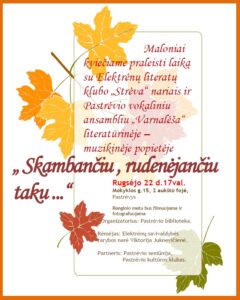 Dalyvaus Elektrėnų literatų klubas „Strėva”, Pastrėvio vokalinis ansamblis „Varnalėša”. Bus minimas Pastrėvio vyr. bibliotekininkės Danutės Kananavičienės 30-ies metų darbo bibliotekoje jubiliejus.
