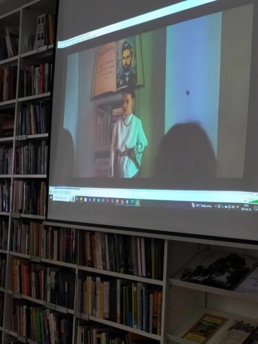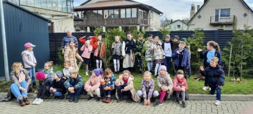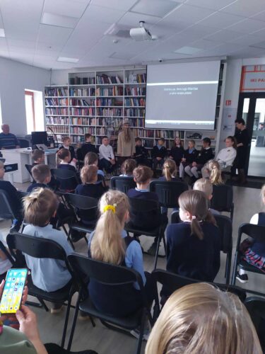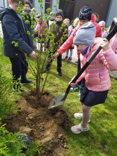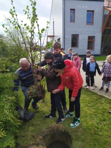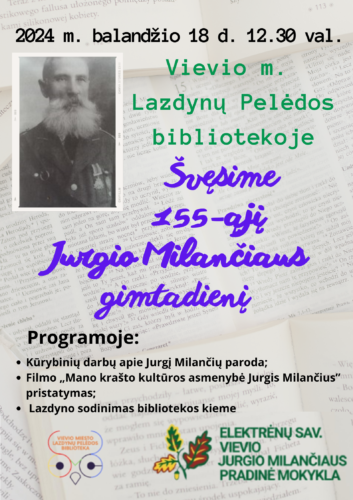 Žiūrėjome vaikų sukurtą filmą „Mano krašto kultūros asmenybė Jurgis Milančius”, bibliotekos kiemelyje pasodinome lazdyną J. Milančiaus atminimui, vaišinomės gimtadienio pyragu.