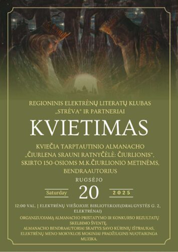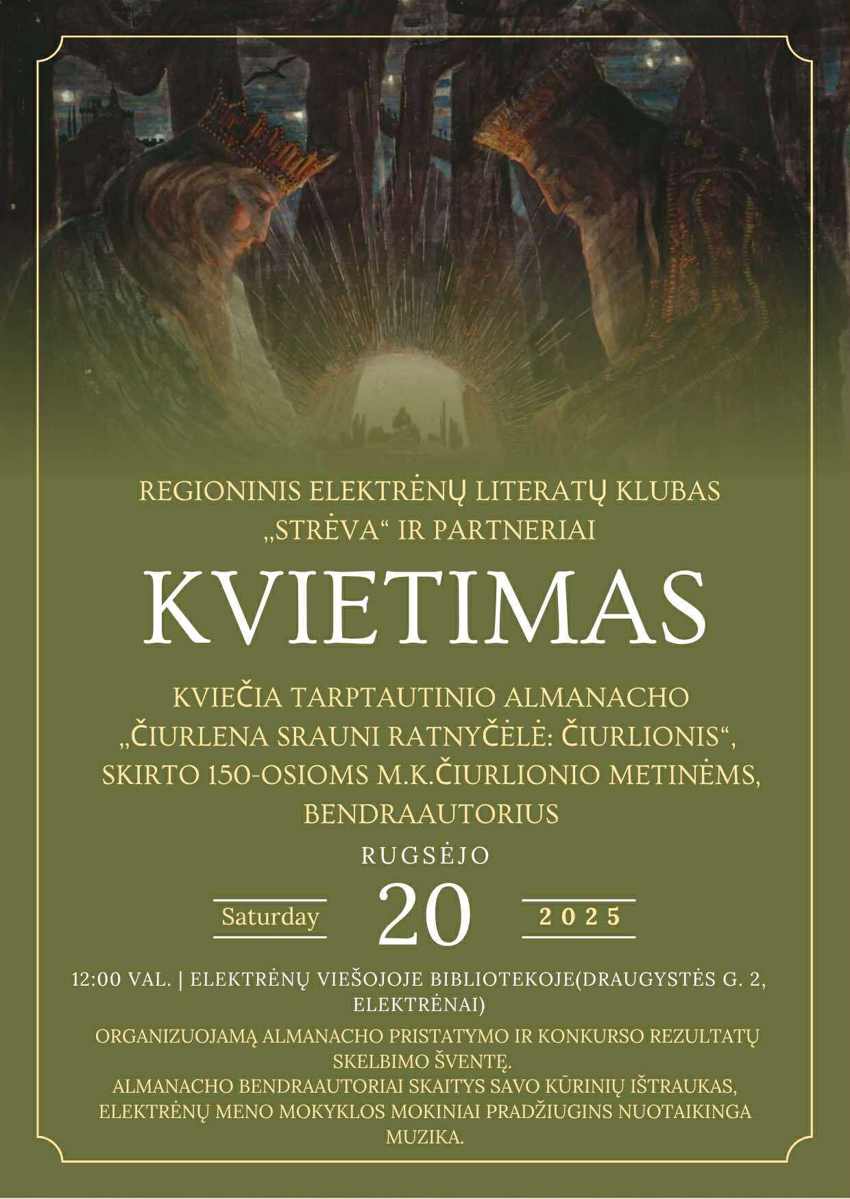 Regioninis Elektrėnų literatų klubas „Strėva“ kartu su partneriais kviečia į tarptautinio almanacho „Čiurlena srauni Ratnyčėlė: Čiurlionis“ pristatymą ir konkurso rezultatų paskelbimo šventę.