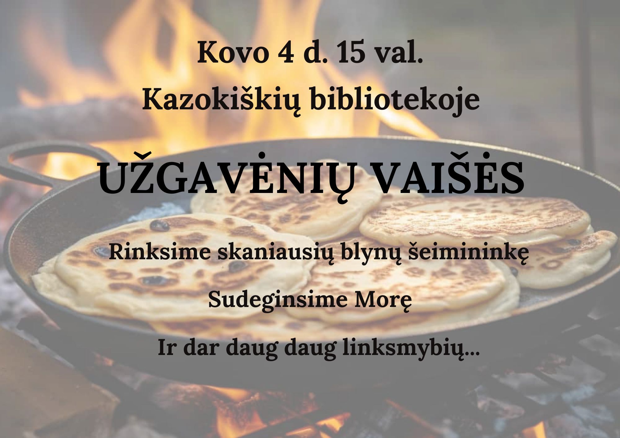 Šeimininkių popietė, skirta Užgavėnėms, kurios metu šeimininkės varžysis skaniausių blynų konkurse. Gaminsime Morę, kurią sudeginsime su šokiais ir dainomis. Kviečiame visus – ir didelius, ir mažus.