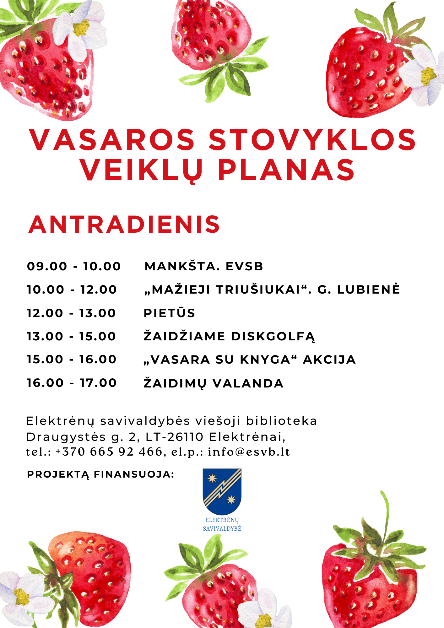 Antradienį stovyklautojai mankštinosi su EVSB visuomenės sveikatos specialiste, susipažino su „Mažaisiais triušiukais” kartu su G. Lubiene ir aktyviai leido laiką žaisdami diskolfą Elektrėnų diskgolfo parke. Akcijos „Vasara su knyga” pristatyme vaikai turėjo puikią progą prisijaukinti knygą ir leistis į skaitymo kelionę.