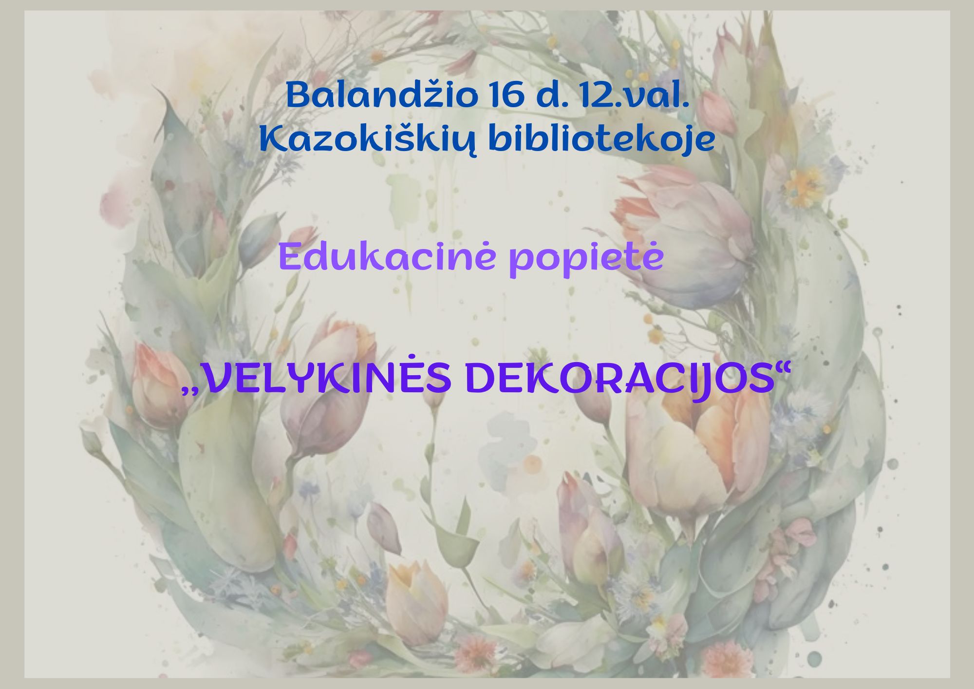 Edukacija visiems, kurios metu gaminsime pavasarines dekoracijas iš gamtinių priemonių pasipuošti namus Šv. Velykų šventiniame laikotarpyje.