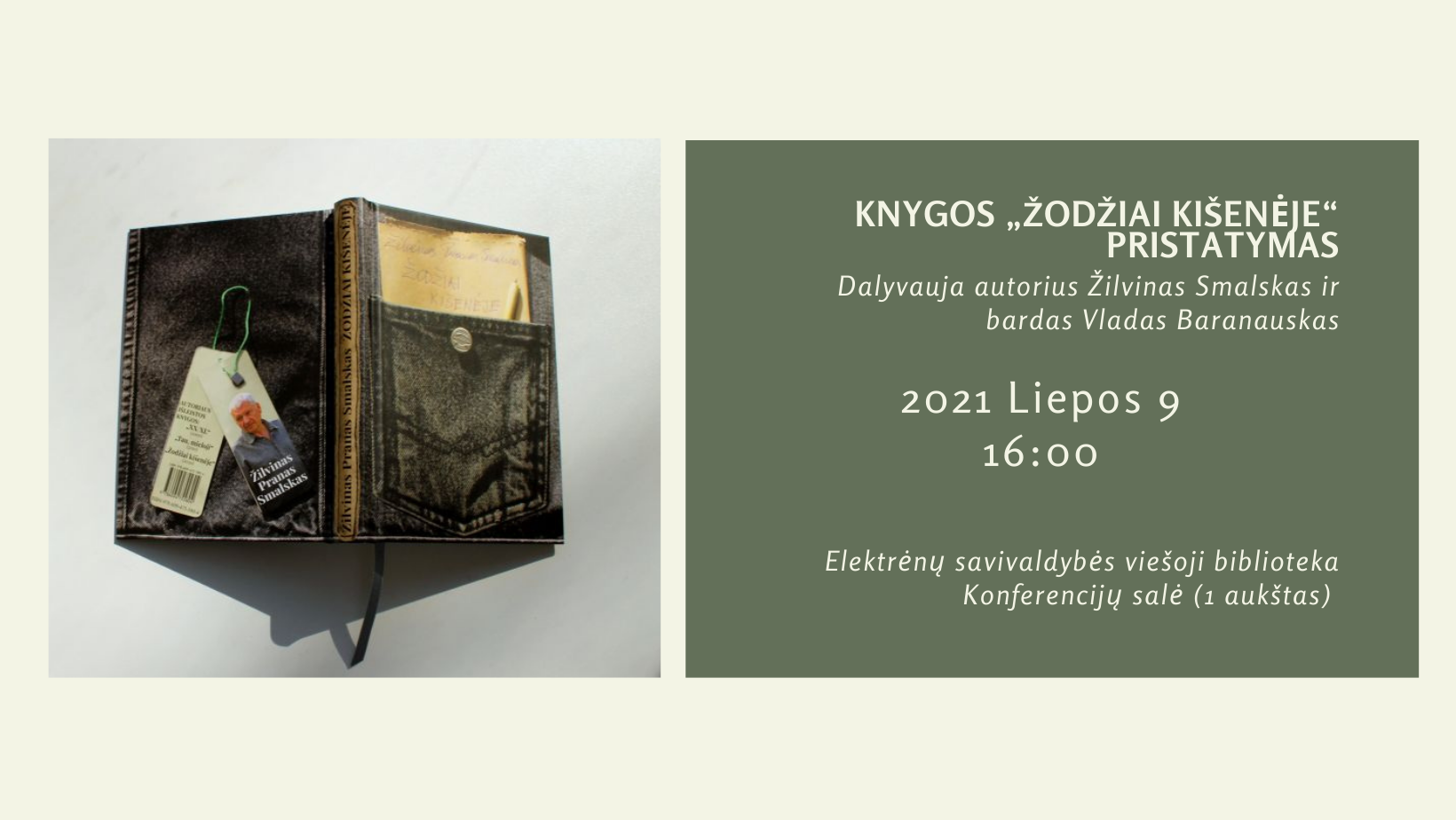 Maloniai kviečiame į poezijos knygos „Žodžiai kišenėje“ pristatymą ir susitikimą su jos autoriumi Žilvinu Pranu Smalsku.